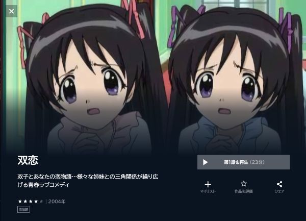 U-NEXTなら、アニメ「双恋」の動画を1話から全13話まで全話視聴できます。