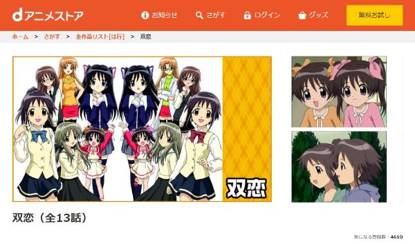 またdアニメストアは、アニメ「双恋」のシリーズや関連動画を全話視聴できます。