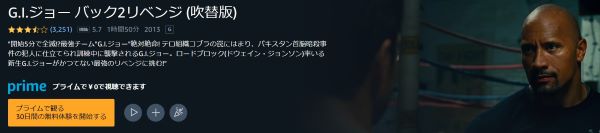 Amazonプライムビデオは、30日間のお試し無料期間があり「G.I.ジョー バック2リベンジ」の映画をフルで視聴することができます。