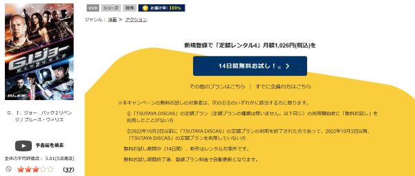 そして、映画「G.I.ジョー バック2リベンジ」はツタヤディスカスで配信しているので、無料でDVDレンタルが可能です。