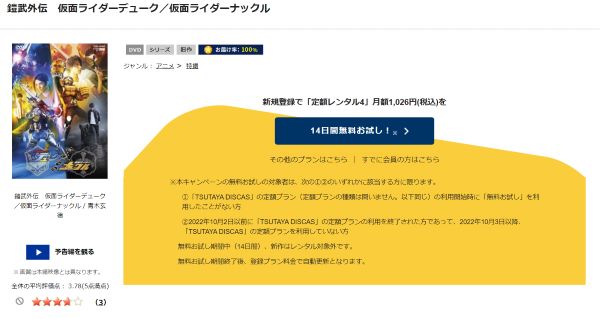 そして、映画「鎧武外伝 仮面ライダーデューク/仮面ライダーナックル」はツタヤディスカスで配信しているので、無料でDVDレンタルが可能です。