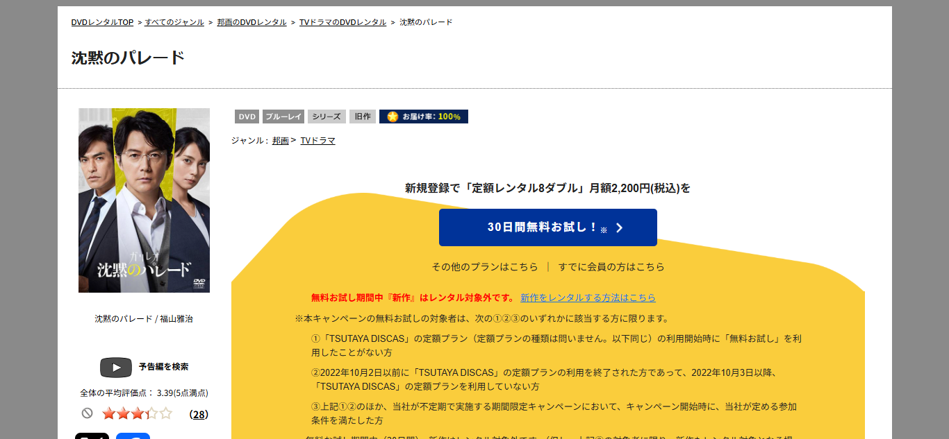 TSUTAYA DISCASは、DVD宅配レンタルサービスで、初回30日間、「定額レンタル8ダブル」の無料トライアルが利用できます。