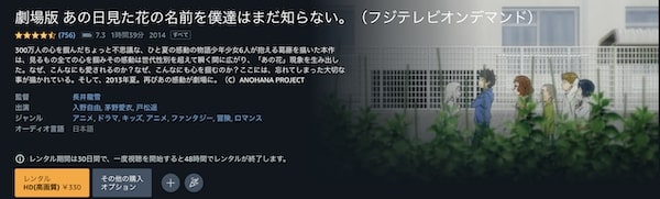 しかし、Amazonプライムビデオは無料期間が30日間ありますが、「劇場版 あの日見た花の名前を僕達はまだ知らない。」の映画はレンタル作品で330円かかってしまうため無料視聴することができません。