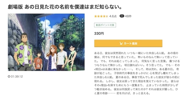 上記の特典が該当していて、アニメ映画「劇場版 あの日見た花の名前を僕達はまだ知らない。」を配信してる配信サイトを紹介します。