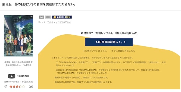 そして、映画「劇場版 あの日見た花の名前を僕達はまだ知らない。」はツタヤディスカスで配信しているので、無料でDVDレンタルが可能です。