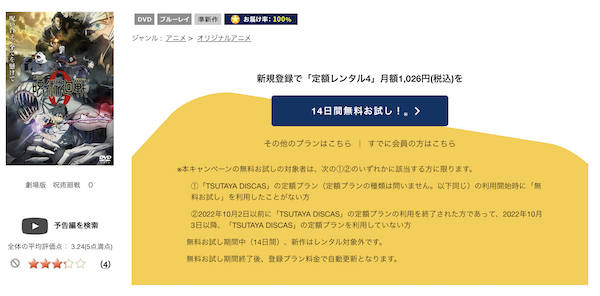 「劇場版 呪術廻戦 0」は新作なので無料で見ることはできませんが、準新作・話題作・旧作が4枚までなら、無料お試し期間中にレンタルができるので、14日間以内ならアニメ「呪術廻戦」や他の見たかった映画も無料でレンタルすることができますよ。