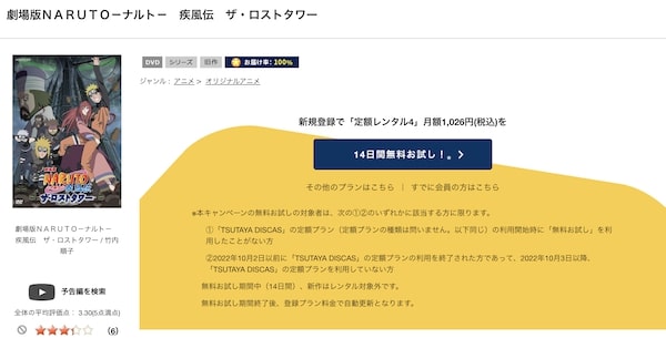 TSUTAYA DISCASで映画「劇場版NARUTO-ナルト- 疾風伝 ザ・ロストタワー」をDVDレンタルでフルで無料視聴