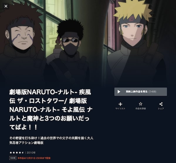 理由は、31日間の無料期間があり、「劇場版NARUTO-ナルト- 疾風伝 ザ・ロストタワー」の映画をフルで配信しているからになります。