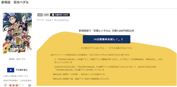 TSUTAYA DISCASは、準新作は8枚まで、話題作・旧作は枚数制限なしでお試し期間中に無料レンタルができ「劇場版 弱虫ペダル」の映画は、旧作なので無料視聴可能です。