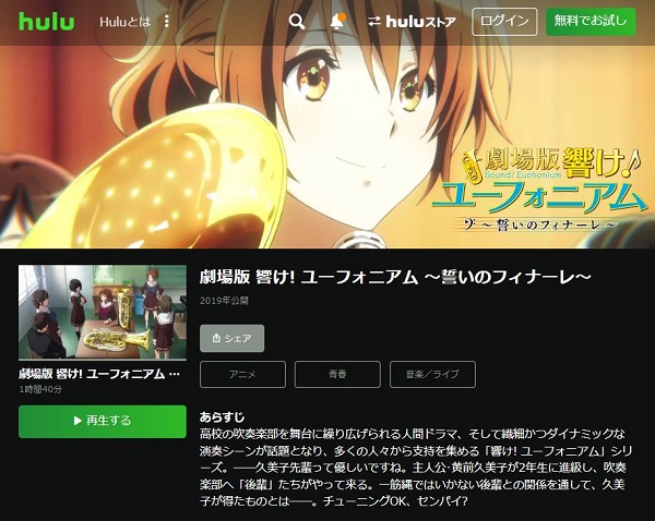 Huluで映画「劇場版 響け!ユーフォニアム〜誓いのフィナーレ〜」をフルで無料視聴