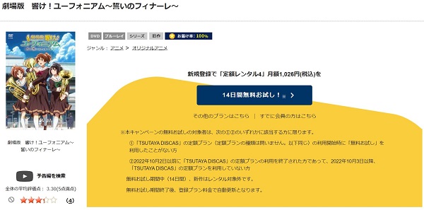 そして、映画「劇場版 響け!ユーフォニアム〜誓いのフィナーレ〜」はツタヤディスカスで配信しているので、無料でDVDレンタルが可能です。