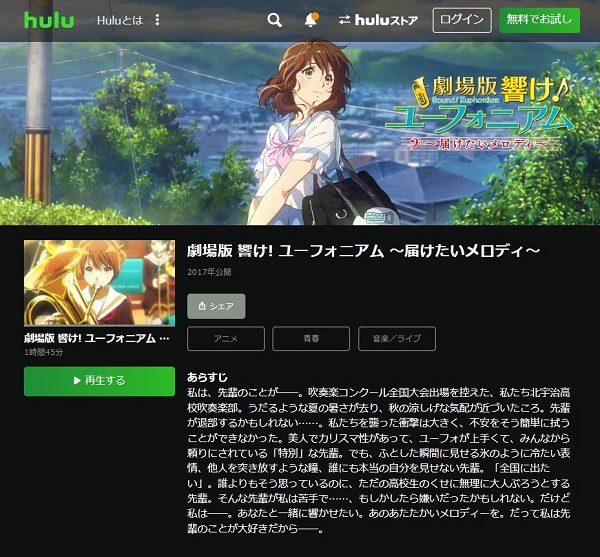 Huluで映画「劇場版 響け!ユーフォニアム〜届けたいメロディ〜」をフルで無料視聴