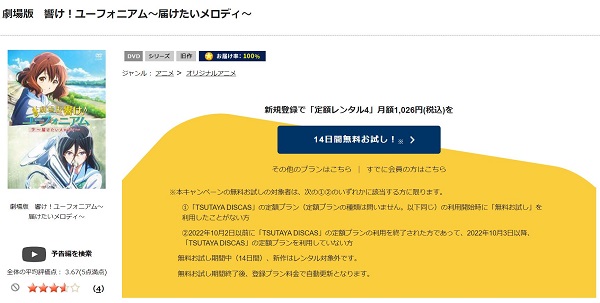 そして、映画「劇場版 響け!ユーフォニアム〜届けたいメロディ〜」はツタヤディスカスで配信しているので、無料でDVDレンタルが可能です。