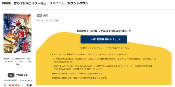 そして、映画「劇場版 さらば仮面ライダー電王 ファイナル・カウントダウン」はツタヤディスカスで配信しているので、無料でDVDレンタルが可能です。