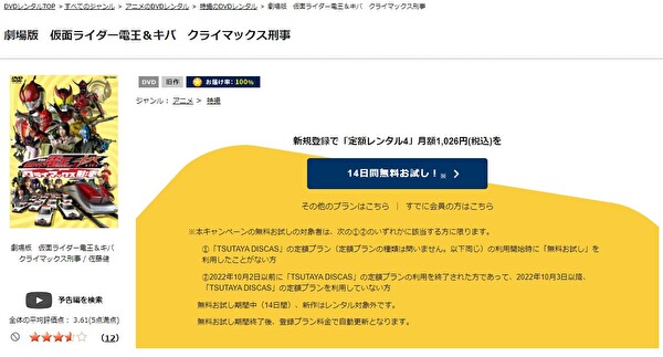 そして、映画「劇場版 仮面ライダー電王&キバ クライマックス刑事」はツタヤディスカスで配信しているので、無料でDVDレンタルが可能です。