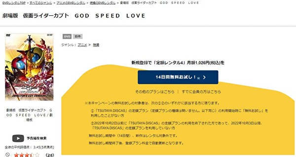 そして、映画「劇場版 仮面ライダーカブト GOD SPEED LOVE」はツタヤディスカスで配信しているので、無料でDVDレンタルが可能です。