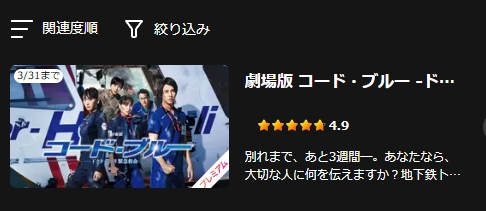 映画「劇場版 コード・ブルー-ドクターヘリ緊急救命-」も配信されており、初回登録時の無料お試し期間を利用してフル視聴が可能です。