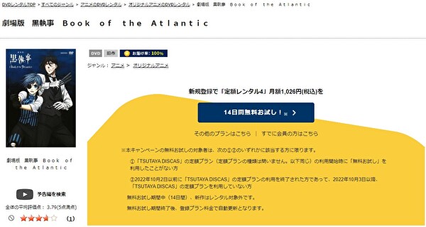 TSUTAYA DISCASなら「劇場版 黒執事 Book of the Atlantic」が見放題なので、お試し期間中の14日間の間に何回も視聴できたり、途中まで視聴して残りを他の日に視聴したりと使い勝手は抜群です。