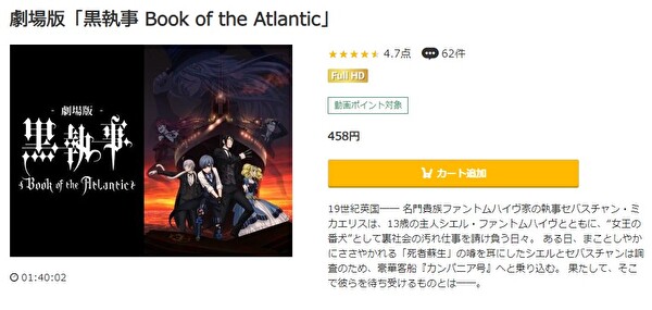 映画「劇場版 黒執事 Book of the Atlantic」の動画は458円でレンタル配信してるので、フルで無料視聴できます。