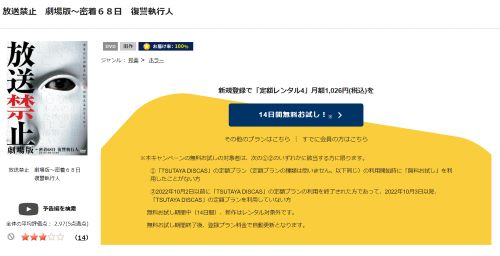ツタヤディスカスは、準新作・話題作・旧作が4枚までなら、無料お試し期間中にレンタルができるので、「放送禁止 劇場版~密着68日 復讐執行人」の映画を無料で視聴した後も14日間以内なら他のシリーズ作品や見たかった映画も無料でレンタルすることができますよ。
