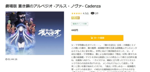 映画「劇場版 蒼き鋼のアルペジオ -アルス・ノヴァ- Cadenza」の動画は440円でレンタル配信してるので、フルで無料視聴できます。
