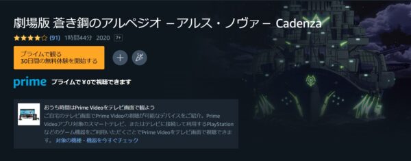 Amazonプライムビデオのお試し期間は、30日間で「劇場版 蒼き鋼のアルペジオ -アルス・ノヴァ- Cadenza」の映画は見放題なので無料視聴が可能です。
