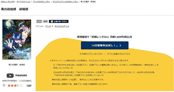 そして、映画「青の祓魔師 ―劇場版―」はツタヤディスカスで配信しているので、無料でDVDレンタルが可能です。