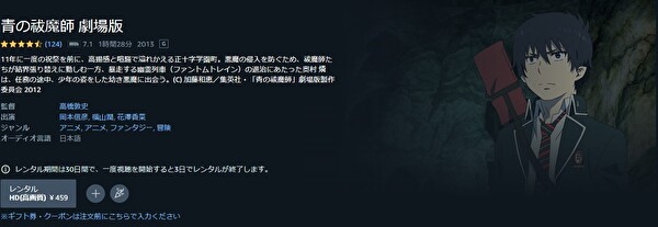 しかし、Amazonプライムビデオは無料期間が30日間ありますが、「青の祓魔師 ―劇場版―」の映画はレンタル作品で459円かかってしまうため無料視聴することができません。