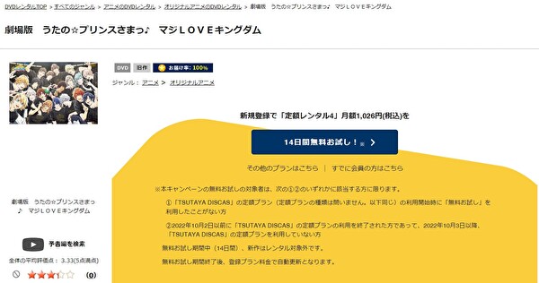 そして、映画「劇場版 うたの☆プリンスさまっ♪ マジLOVEキングダム」はツタヤディスカスで配信しているので、無料でDVDレンタルが可能です。