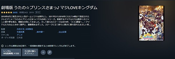 しかし、Amazonプライムビデオは無料期間が30日間ありますが、「劇場版 うたの☆プリンスさまっ♪ マジLOVEキングダム」の映画はレンタル作品で550円かかってしまうため無料視聴することができません。