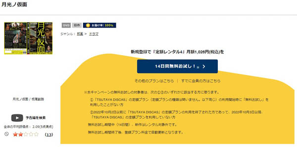 『TSUTAYA DISCAS』は30日間のお試し期間が初回特典で利用できるので「月光ノ仮面」の動画をフルで無料視聴できますよ。