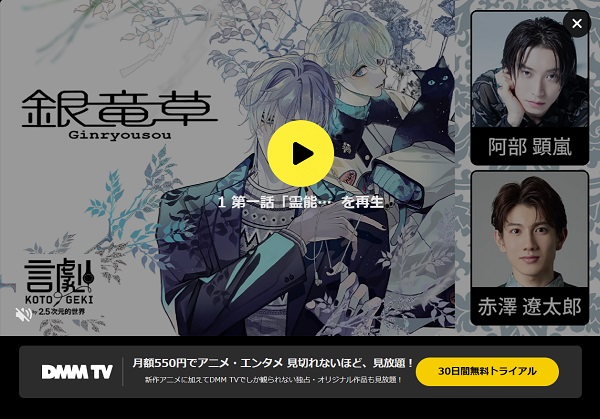 『DMMTV』は初回登録で、30日間のお試し期間があるのでアニメ「銀竜草」をお試しで全話視聴することができますよ。