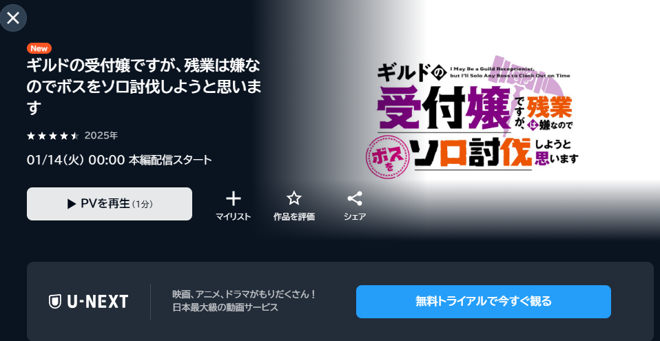先に結論をお伝えすると、アニメ「ギルドの受付嬢ですが、残業は嫌なのでボスをソロ討伐しようと思います」は、『U-NEXT』の動画配信サイトで無料トライアル期間中に全話視聴が可能です。