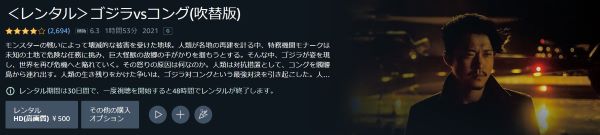 しかし、映画「ゴジラVSコング」はレンタル作品のため、500円かかってしまい無料視聴することができません。