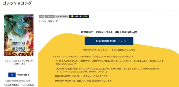 そして、映画「ゴジラVSコング」はツタヤディスカスで配信しているので、無料でDVDレンタルが可能です。