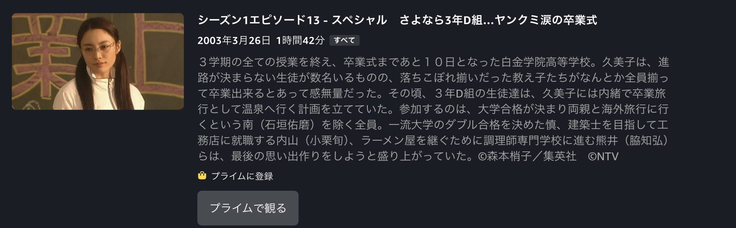 Amazonプライムでドラマ「ごくせん スペシャル「さよなら3年D組…ヤンクミ涙の卒業式」の動画を無料視聴