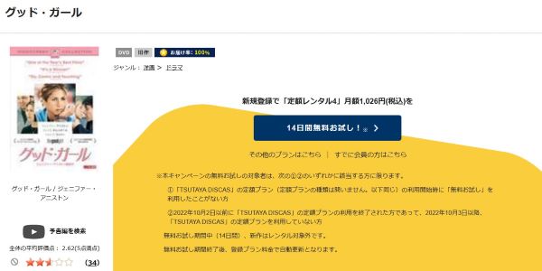 そして、映画「グッド・ガール」はツタヤディスカスで配信しているので、無料でDVDレンタルが可能です。