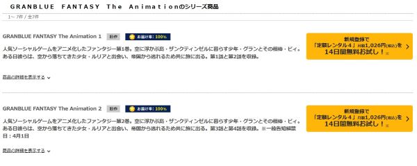 動画配信サービスとは少し違い、DVDレンタルサービスになりお試し期間で、「GRANBLUE FANTASY The Animation(1期)」の動画を全話視聴することができます。