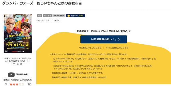 そして、映画「グランパ・ウォーズ」はツタヤディスカスで配信しているので、無料でDVDレンタルが可能です。