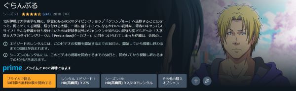 Amazonプライムでは、レンタルでアニメ「ぐらんぶる」が配信されており、月額料金は30日間の無料期間があるので、レンタル料金のみでアニメを全話視聴ができます。