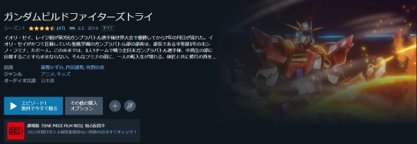 Amazonプライムはアニメ「ガンダムビルドファイターズトライ」は無料で視聴できませんが、関連動画やシリーズ作品には見放題で配信されているものもあります。