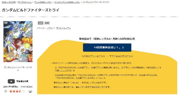 TSUTAYA DISCASは、準新作は8枚まで、話題作・旧作は枚数制限なしでお試し期間中に無料レンタルができ「ガンダムビルドファイターズトライ」のアニメは、旧作なので無料視聴可能です。