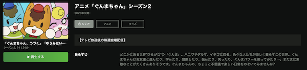 また、アニメ「ぐんまちゃん シーズン2」の関連動画など、「ぐんまちゃん シーズン2」の動画以外もU-NEXTは楽しめます。