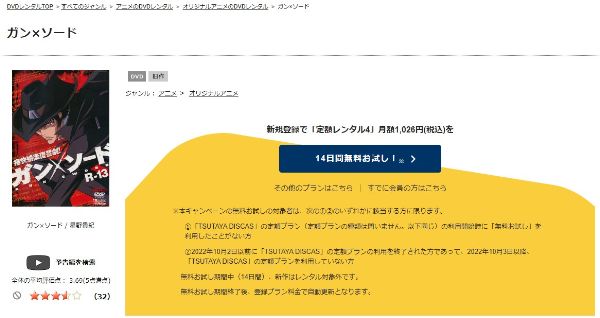 TSUTAYA DISCASは、準新作は8枚まで、話題作・旧作は枚数制限なしでお試し期間中に無料レンタルができ「ガン×ソード」のアニメは、旧作なので無料視聴可能です。