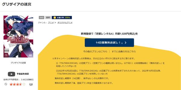 TSUTAYA DISCASは、準新作は8枚まで、話題作・旧作は枚数制限なしでお試し期間中に無料レンタルができ「グリザイアの迷宮」のアニメは、旧作なので無料視聴可能です。