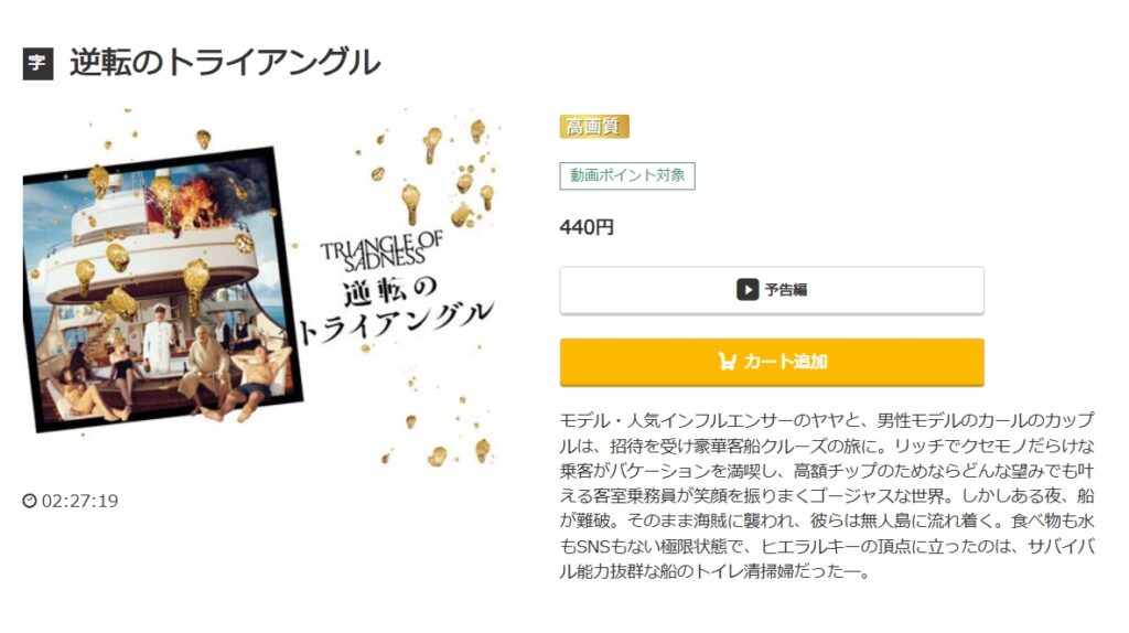 初回登録時に1,600円分のポイントがもらえるので、440ポイントでレンタル配信している映画「逆転のトライアングル」は無料で視聴できます。