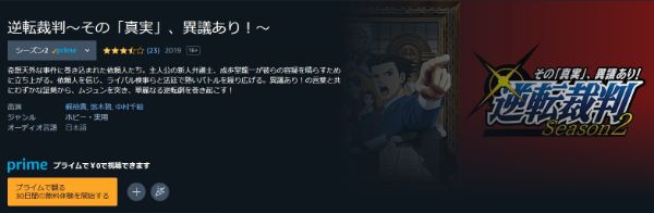 Amazonプライムでも、アニメ「逆転裁判 ~その「真実」、異議あり!~ Season2」は見放題で配信されており、30日間の無料期間があるので、余裕を持って「逆転裁判 ~その「真実」、異議あり!~ Season2」のアニメを全話視聴ができます。