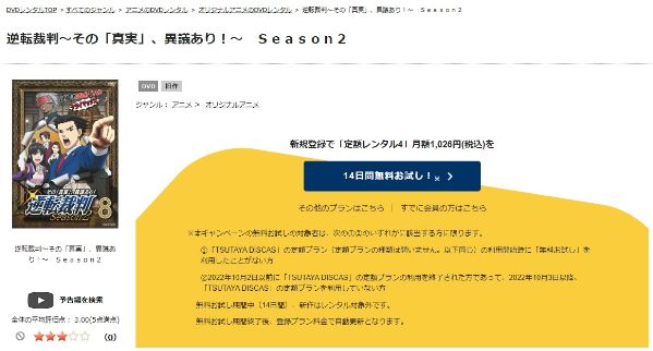 動画配信サービスとは少し違い、DVDレンタルサービスになりお試し期間で、「逆転裁判 ~その「真実」、異議あり!~ Season2」の動画を全話視聴することができます。