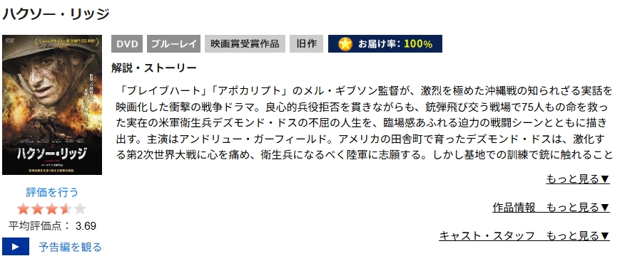 映画「ハクソー・リッジ」は旧作なので、DVDレンタルすればフル視聴が可能です。