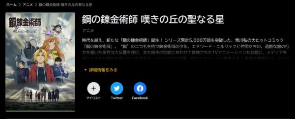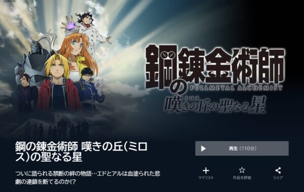理由は、31日間の無料期間があり、「鋼の錬金術師 嘆きの丘(ミロス)の聖なる星」の映画をフルで配信しているからになります。